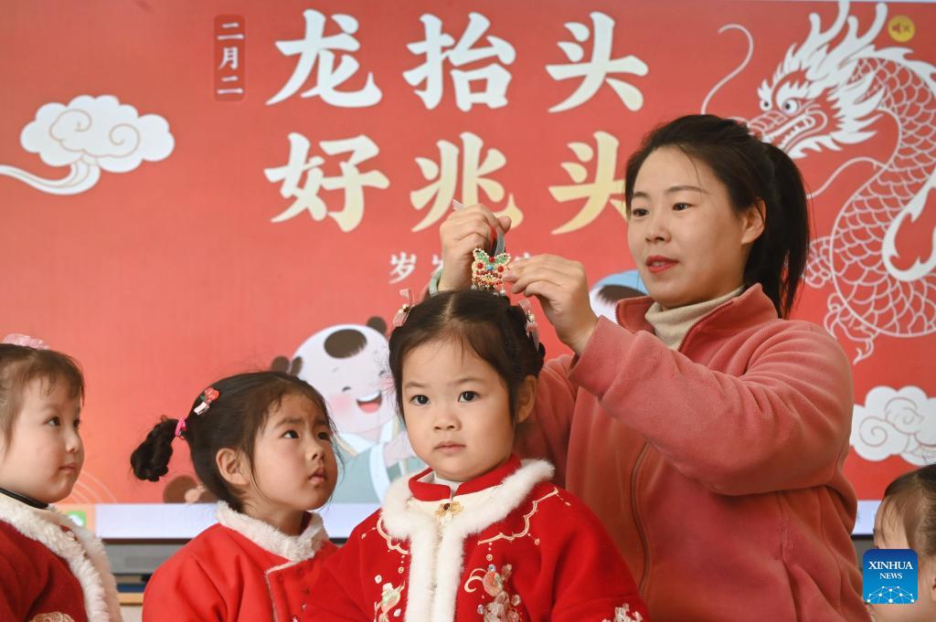 A teacher braids a girl's hair and adjusts her hair accessory at a kindergarten in Qinyang, central China's Henan Province, on March 20, 2026. The spring equinox falls on March 20. This year, it also marks Longtaitou, also known as Dragon Head-raising Day, a significant occasion in the lunar calendar, celebrated by various activities across China. (Photo by Yang Fan/Xinhua)