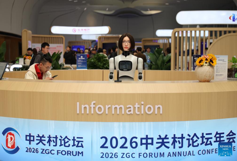 A humanoid robot (1st R) makes self-introduction at an information desk of the Zhongguancun International Innovation Center in Beijing, capital of China, March 24, 2026. Themed "Full Integration Between Technological and Industrial Innovation," this year's Zhongguancun Forum will be held in Beijing from March 25 to 29. More than 1,000 guests from over 100 countries and regions are expected to participate in the forum, which features more than 100 events. (Xinhua/Ju Huanzong)