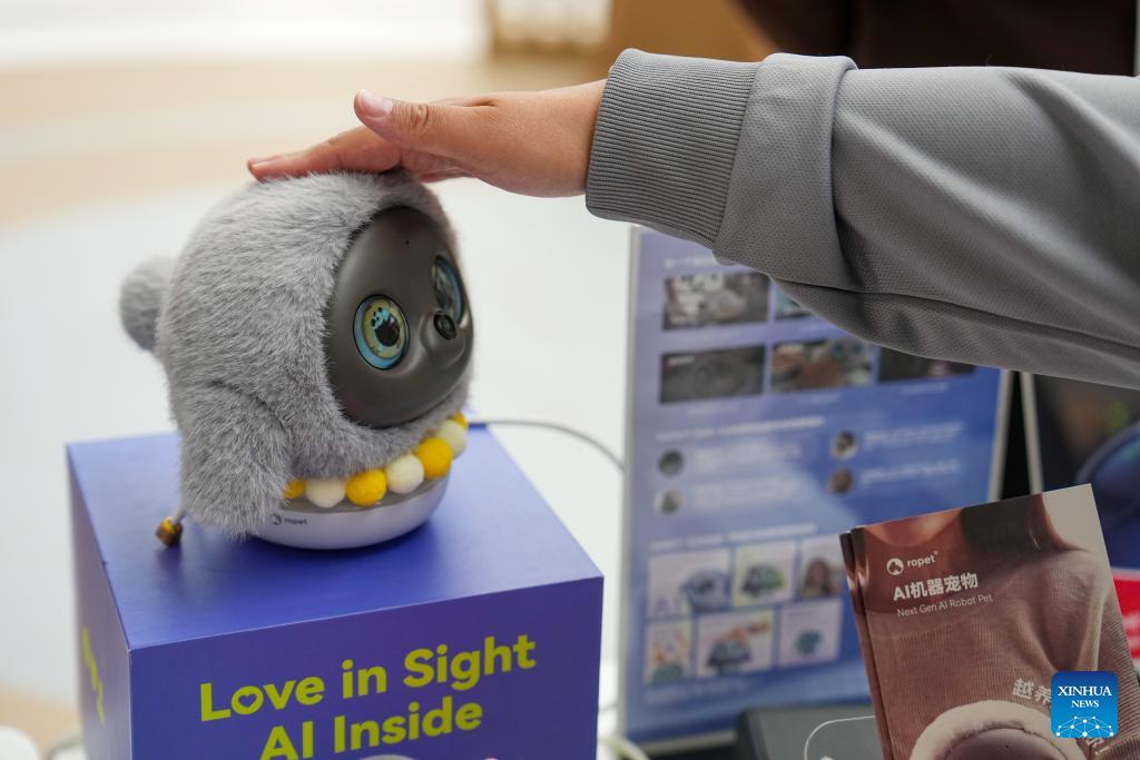 A visitor interacts with a robot pet at the Zhongguancun International Innovation Center in Beijing, capital of China, March 24, 2026. Themed "Full Integration Between Technological and Industrial Innovation," this year's Zhongguancun Forum will be held in Beijing from March 25 to 29. More than 1,000 guests from over 100 countries and regions are expected to participate in the forum, which features more than 100 events. (Xinhua/Ju Huanzong)