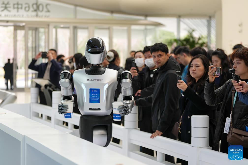 A humanoid robot serves drinks at the Zhongguancun International Innovation Center in Beijing, capital of China, March 24, 2026. Themed "Full Integration Between Technological and Industrial Innovation," this year's Zhongguancun Forum will be held in Beijing from March 25 to 29. More than 1,000 guests from over 100 countries and regions are expected to participate in the forum, which features more than 100 events. (Xinhua/Ju Huanzong)