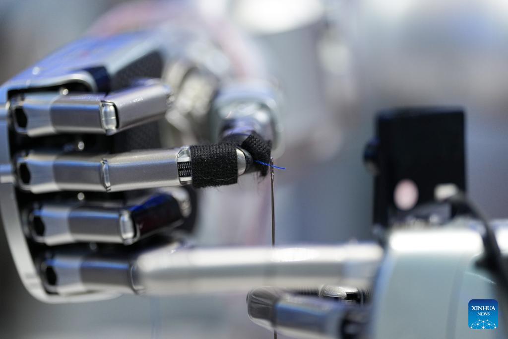 A robot displays threading at the Zhongguancun Exhibition Center in Beijing, capital of China, March 24, 2026. Themed "Full Integration Between Technological and Industrial Innovation," this year's Zhongguancun Forum will be held in Beijing from March 25 to 29. More than 1,000 guests from over 100 countries and regions are expected to participate in the forum, which features more than 100 events. (Xinhua/Ju Huanzong)