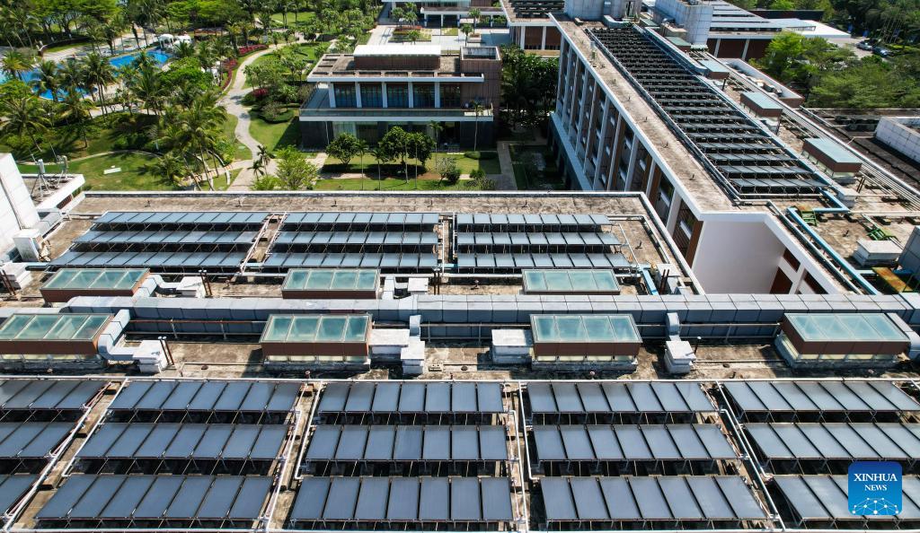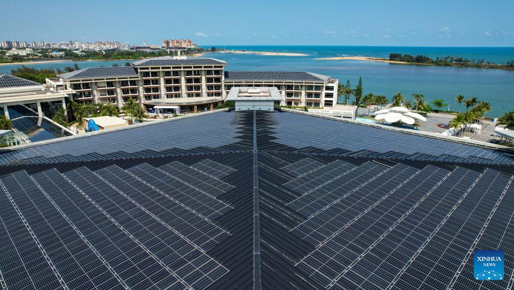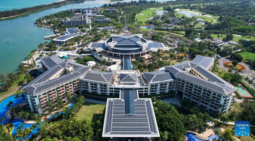 An aerial drone photo taken on March 19, 2026 shows photovoltaic devices on the roof of the Boao Forum for Asia (BFA) International Conference Center and the BFA hotel in the Boao zero-carbon demonstration zone in Boao, south China's Hainan Province. Since the "Boao Near-Zero Carbon Demonstration Zone" was renamed the "Boao Zero-Carbon Demonstration Zone" in March 2025, the area has achieved notable progress in energy conservation and carbon reduction and has fully entered a stage of normalized zero-carbon operation. According to measured data, energy-related carbon dioxide emissions from buildings and municipal infrastructure in the zone dropped from 11,350.1 tonnes in 2019 to about 14.6 tonnes in 2025, a reduction of 99.9 percent. The zone generated 29 million kWh of green electricity a year, meeting its yearly power demand of about 19.4 million kWh, with the remaining 9.6 million kWh fed into the grid. (Xinhua/Yang Guanyu)