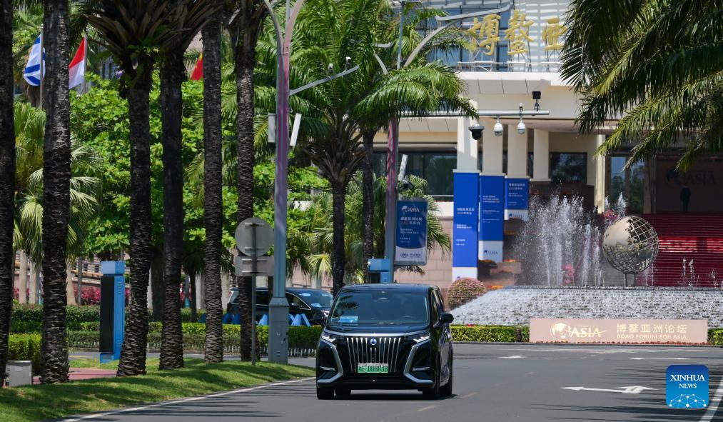 An electric vehicle is seen on a street in the Boao zero-carbon demonstration zone in Boao, south China's Hainan Province, March 24, 2026. Since the "Boao Near-Zero Carbon Demonstration Zone" was renamed the "Boao Zero-Carbon Demonstration Zone" in March 2025, the area has achieved notable progress in energy conservation and carbon reduction and has fully entered a stage of normalized zero-carbon operation. According to measured data, energy-related carbon dioxide emissions from buildings and municipal infrastructure in the zone dropped from 11,350.1 tonnes in 2019 to about 14.6 tonnes in 2025, a reduction of 99.9 percent. The zone generated 29 million kWh of green electricity a year, meeting its yearly power demand of about 19.4 million kWh, with the remaining 9.6 million kWh fed into the grid. (Xinhua/Yang Guanyu)