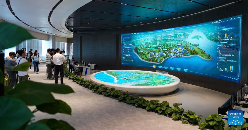This photo taken on March 23, 2026 shows an operation management center of the Boao zero-carbon demonstration zone in Boao, south China's Hainan Province. Since the "Boao Near-Zero Carbon Demonstration Zone" was renamed the "Boao Zero-Carbon Demonstration Zone" in March 2025, the area has achieved notable progress in energy conservation and carbon reduction and has fully entered a stage of normalized zero-carbon operation. According to measured data, energy-related carbon dioxide emissions from buildings and municipal infrastructure in the zone dropped from 11,350.1 tonnes in 2019 to about 14.6 tonnes in 2025, a reduction of 99.9 percent. The zone generated 29 million kWh of green electricity a year, meeting its yearly power demand of about 19.4 million kWh, with the remaining 9.6 million kWh fed into the grid. (Xinhua/Yang Guanyu)