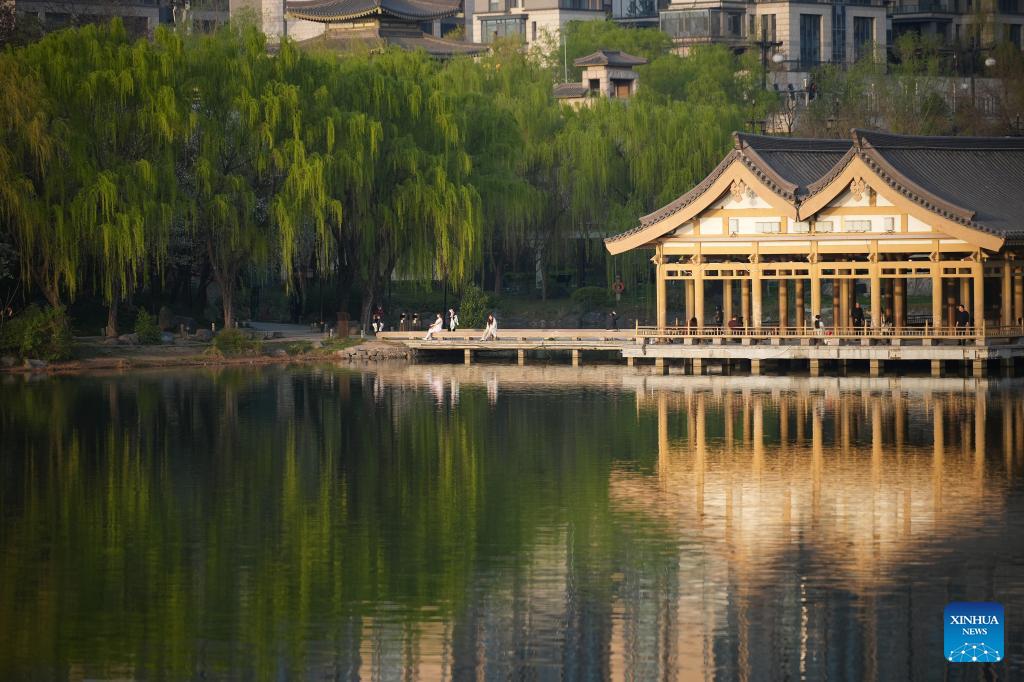 People enjoy their leisure time at Qujiang Lake Heritage Park in Xi'an, northwest China's Shaanxi Province, March 24, 2026. Xi'an served as China's capital in 13 dynasties, from Western Zhou Dynasty (1046 BC-771 BC) to Tang Dynasty (618-907). It was a custom in history for the emperors to treat outstanding scholars to feasts by the Qujiang Lake, which has now been renovated into a holiday resort in the southeast of Xi'an. (Xinhua/Shao Rui)