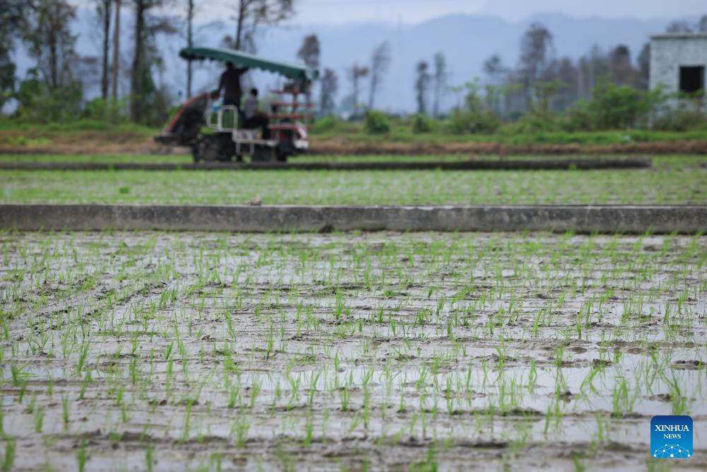 Staff members operate the rice transplanter to transplant rice seedlings in the field in Duhu Town of Taishan, south China's Guangdong Province, March 24, 2026. In recent years, Taishan has been promoting the transformation of traditional farming into "smart grain cultivation" through technological empowerment. The mechanized transplanting rate of rice has reached 94.5 percent, while the comprehensive mechanization rate of plowing, sowing and harvesting has reached 98.35 percent. (Xinhua/Mao Siqian)