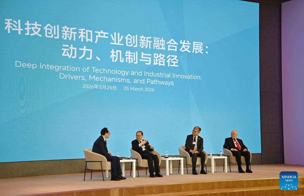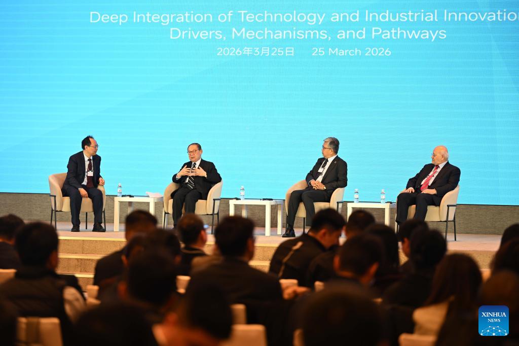 This photo taken on March 25, 2026 shows a view of the Tianjin 2026 Global Business Leaders Roundtable in north China's Tianjin. Themed with "Deep Integration of Technology and Industrial Innovation: Drivers, Mechanisms, and Pathways," the event kicked off on Wednesday. Nearly 300 participants from over 30 countries and regions exchanged views on various topics such as global value chain, innovation-driven development, artificial intelligence, green computing, port-industry-city integrated development, and modernization of traditional Chinese medicine. (Xinhua/Zhao Zishuo)
