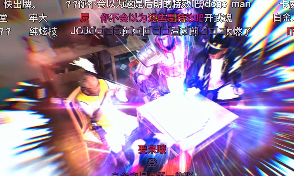 Suddenly, when one challenger shouts, "A pair of Queens!" The "landlord" opens his eyes, a red glow seemingly flashing in his right eye, and slams down a bomb - four sixes. At the same time, a burst of purple light blazes behind him, and the anime character JoJo from JoJo's Bizarre Adventure appears in the glow, holding oversize poker cards and slamming them on the table together with the "landlord."