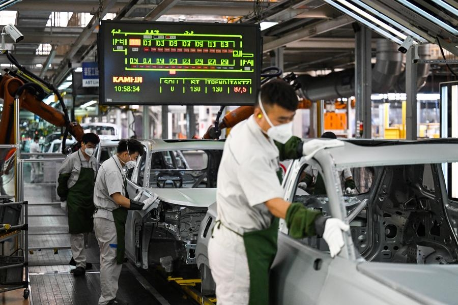 Staff members check products in process inside a welding workshop at the north China base of FAW-Volkswagen in north China's Tianjin, July 7, 2025. (File photo: Xinhua)