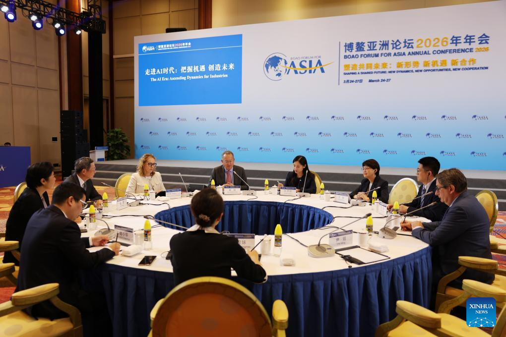 This photo taken on March 26, 2026 shows a scene at a panel discussion themed on "The AI Era: Ascending Dynamics for Industries" during the Boao Forum for Asia (BFA) Annual Conference 2026 in Boao, south China's Hainan Province, March 26, 2026. (Xinhua/Wang Yiliang)