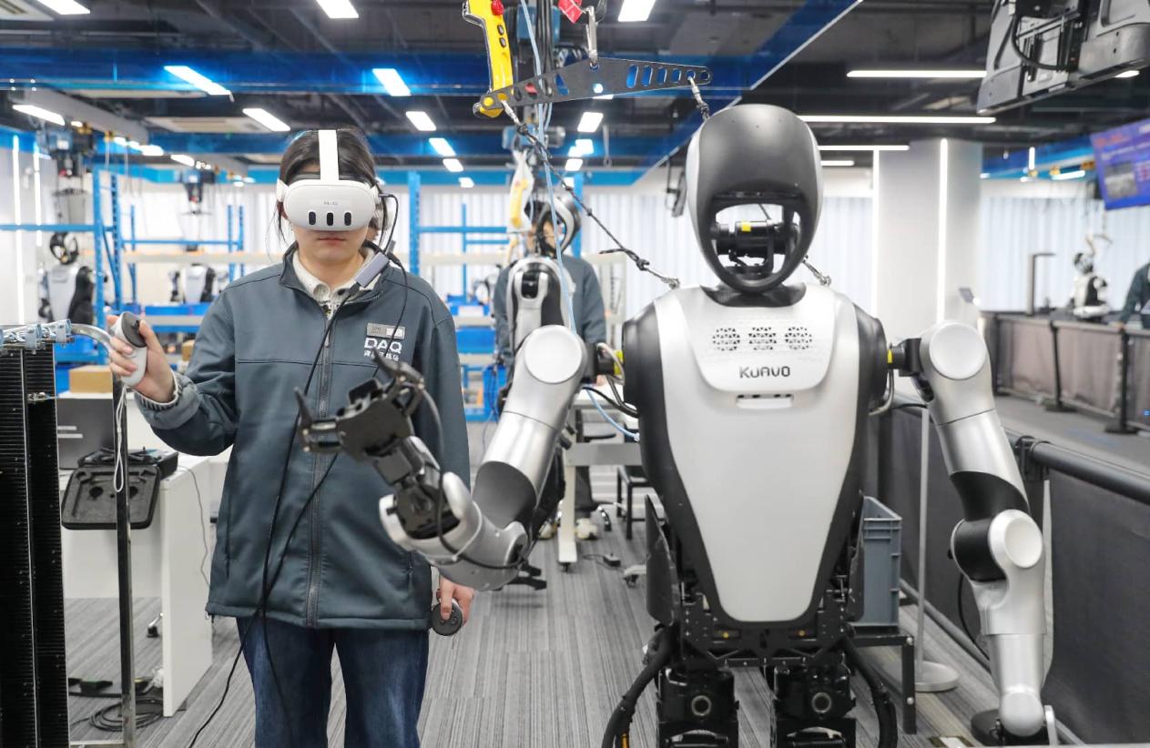 At a humanoid robot data collection training site in Qingdao, east China's Shandong province, a data collection specialist guides a robot as it simulates loading printed circuit board onto a production line in a factory setting. (Photo: Zhang Jingang)