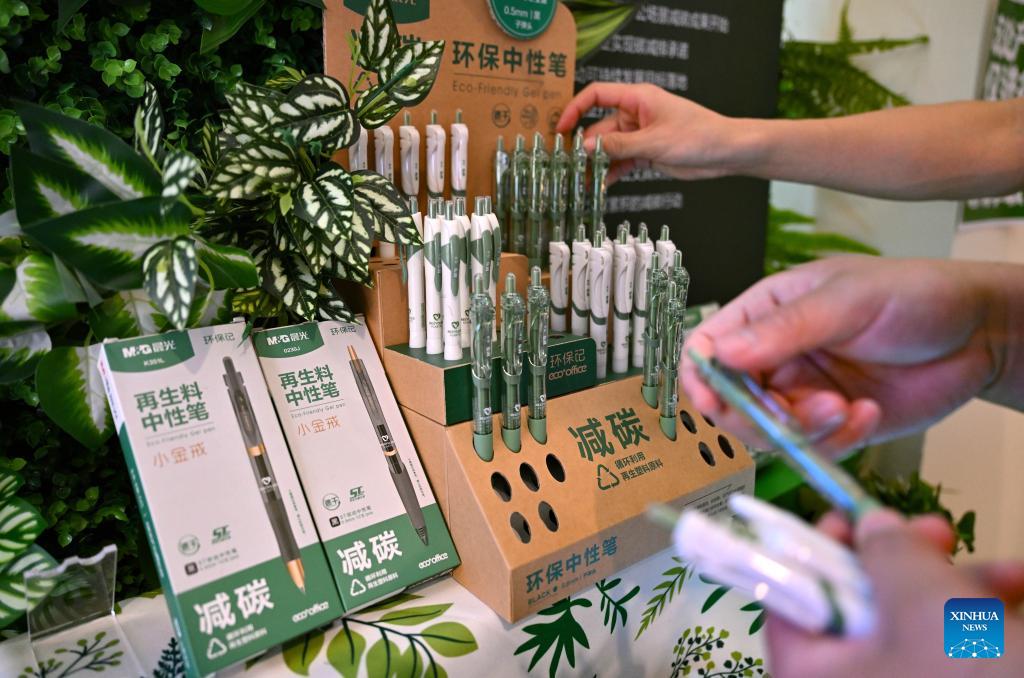 This photo shows eco-friendly rollerball pens on display at the venue of Boao Forum for Asia (BFA) Annual Conference 2026 in Boao, south China's Hainan Province, March 25, 2026. Since the Boao Forum for Asia (BFA) was established 25 years ago, the concept of green operations has remained a steadfast principle of its annual conferences. This year's conference has further deepened green practices throughout the process, integrating sustainable development into all aspects such as venue operations, transportation support, conference services, among others. (Xinhua/Guo Cheng)