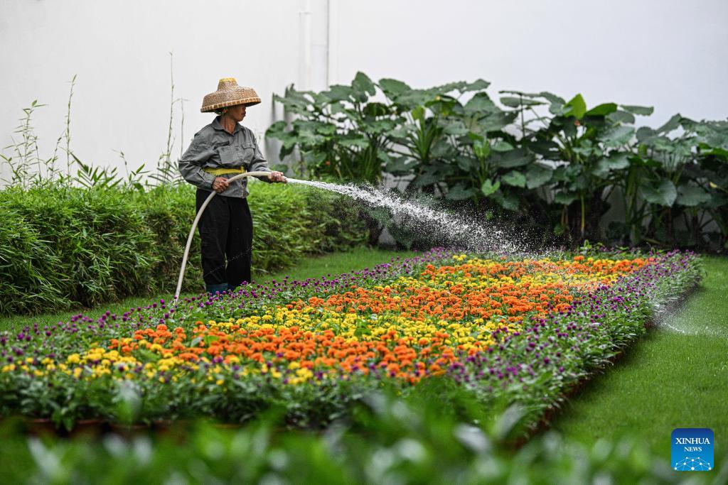 A staff member waters plants outside the venue of Boao Forum for Asia (BFA) Annual Conference 2026 in Boao, south China's Hainan Province, March 27, 2026. Since the Boao Forum for Asia (BFA) was established 25 years ago, the concept of green operations has remained a steadfast principle of its annual conferences. This year's conference has further deepened green practices throughout the process, integrating sustainable development into all aspects such as venue operations, transportation support, conference services, among others. (Xinhua/Pu Xiaoxu)