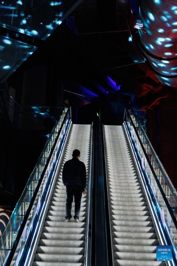 A participant takes an escalator during the China Science Fiction Convention 2026 in Beijing, capital of China, March 27, 2026. The convention kicked off here on Friday. (Xinhua/Jin Liwang)