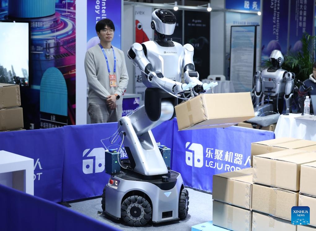 A robot moves a box during the International Sci-Fi and Future Tech Expo Beijing 2026 in Beijing, capital of China, March 27, 2026. (Xinhua/Zhang Chenlin)
