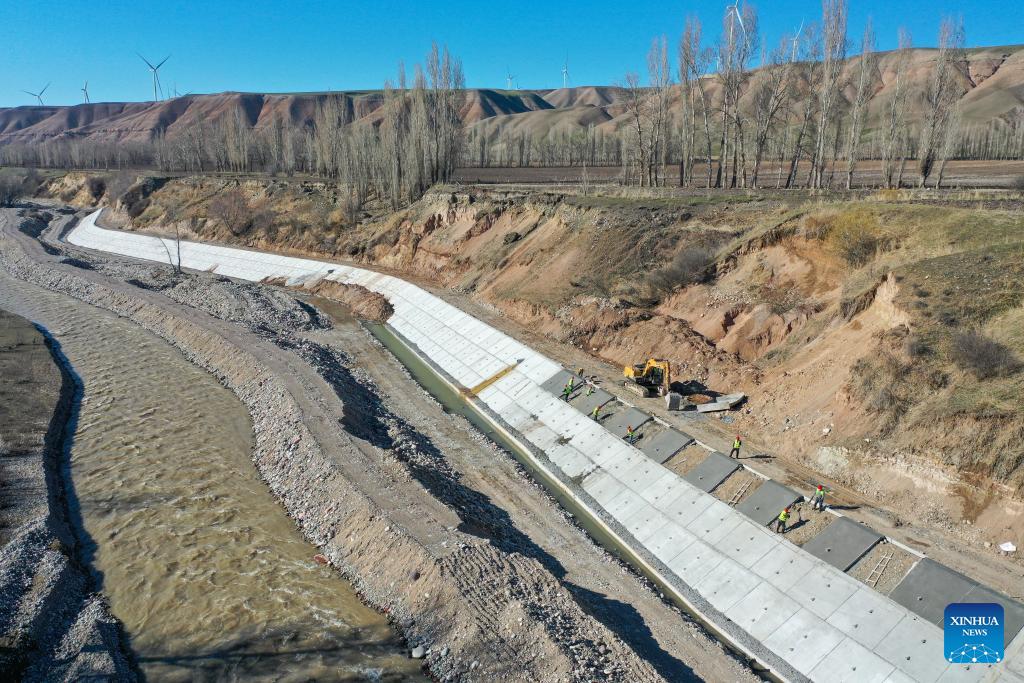 A drone photo taken on March 27, 2026 shows workers building the revetment of a river in Xinyuan County of Ili Kazak Autonomous Prefecture, northwest China's Xinjiang Uygur Autonomous Region. Recently, in response to the potential flood risks caused by snowmelt in the Tianshan and Altay Mountains, local authorities in Ili have conducted thorough hazard identification and rectification, increased the frequency of meteorological and hydrological monitoring, stockpiled sufficient flood control supplies, and established emergency rescue teams to prevent flood-related disasters during the flood season. (Xinhua/Ding Lei)