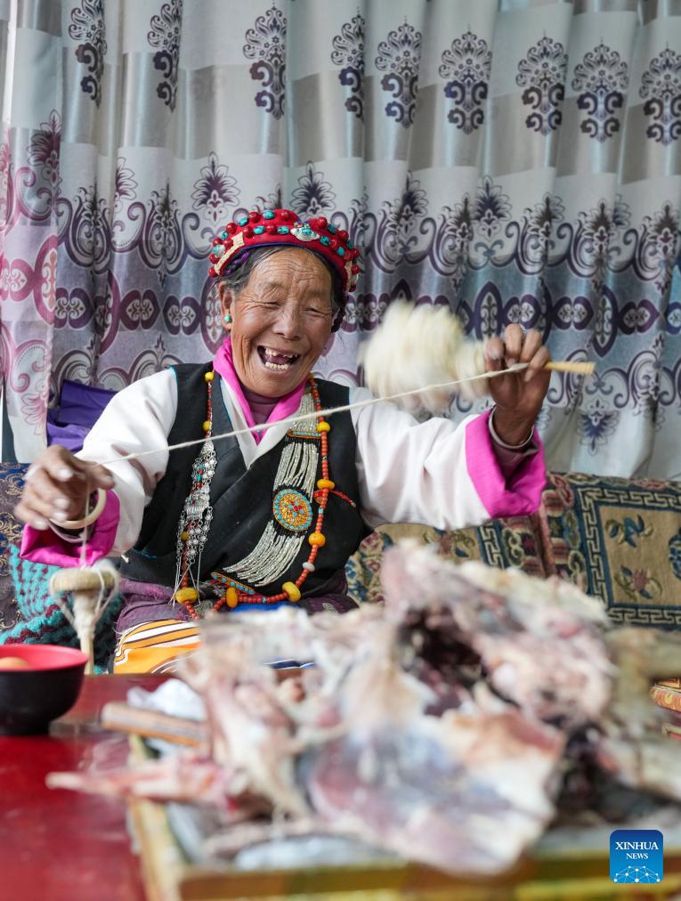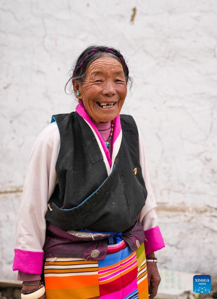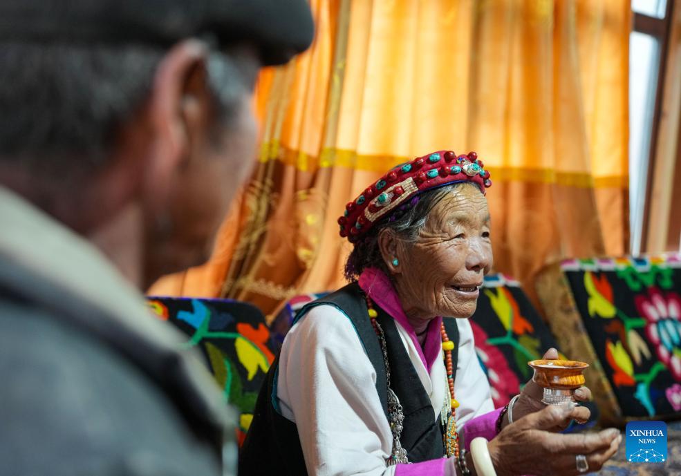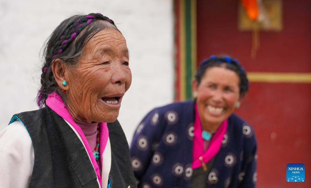 LHASA, March 28 (Xinhua) -- Pudron, in her eighties, sits on a thick Tibetan sofa in her sunlit home, dressed in vibrant traditional attire, with a silver necklace gleaming around her neck.