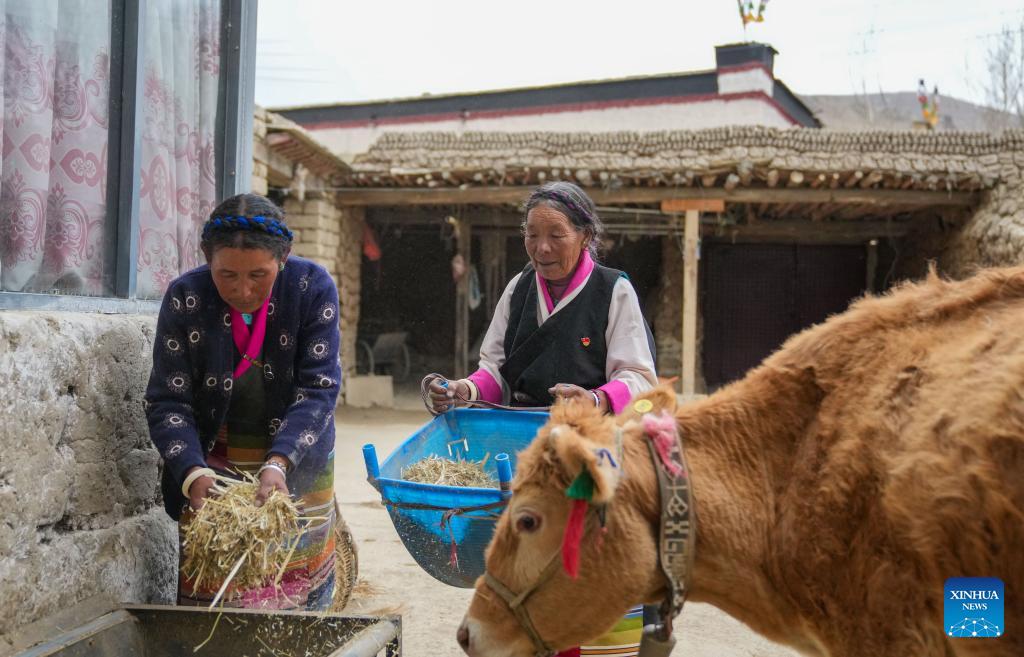 Pudron (R) and her daughter-in-law feed the cattle in Lumpa village of Xigaze City, southwest China's Xizang Autonomous Region, March 12, 2026. Pudron, 86, lives in Lumpa village of Xigaze City. She can never forget the old days when life was full of hardship but dignity.