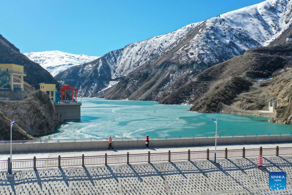An aerial drone photo taken on March 27, 2026 shows staff members inspecting a river hydropower complex in Xinyuan County of Ili Kazak Autonomous Prefecture, northwest China's Xinjiang Uygur Autonomous Region. Recently, in response to the potential flood risks caused by snowmelt in the Tianshan and Altay Mountains, local authorities in Ili have conducted thorough hazard identification and rectification, increased the frequency of meteorological and hydrological monitoring, stockpiled sufficient flood control supplies, and established emergency rescue teams to prevent flood-related disasters during the flood season. (Xinhua/Ding Lei)