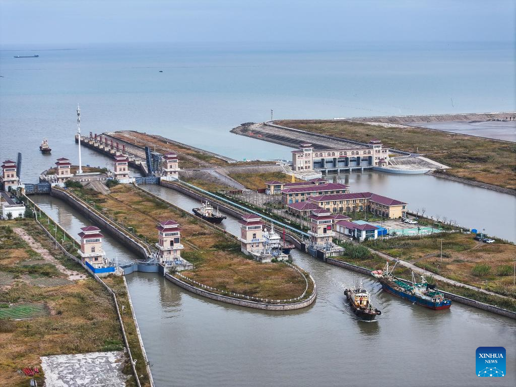 An aerial drone photo taken on Nov. 10, 2024 shows a view of Lyusi fishing port in Qidong City under Nantong, east China's Jiangsu Province. In recent years, Nantong has scaled up efforts to improve the water conservancy system, coupled with its green development endeavors in river basins and seaside areas. (Xinhua/Ji Chunpeng)