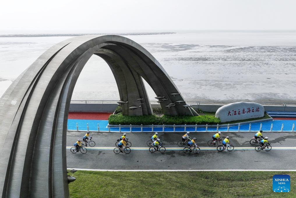 An aerial drone photo taken on Sept. 17, 2023 shows people riding along a coastal lane in Qidong City under Nantong, east China's Jiangsu Province. In recent years, Nantong has scaled up efforts to improve the water conservancy system, coupled with its green development endeavors in river basins and seaside areas. (Xinhua/Ji Chunpeng)