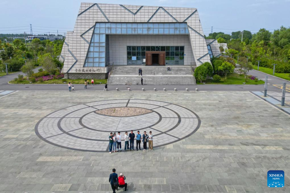 An aerial drone photo taken on May 4, 2024 shows people posing for a group photo in front of a museum in Haian City under Nantong, east China's Jiangsu Province. In recent years, Nantong has scaled up efforts to improve the water conservancy system, coupled with its green development endeavors in river basins and seaside areas. (Photo by Gu Binbin/Xinhua)