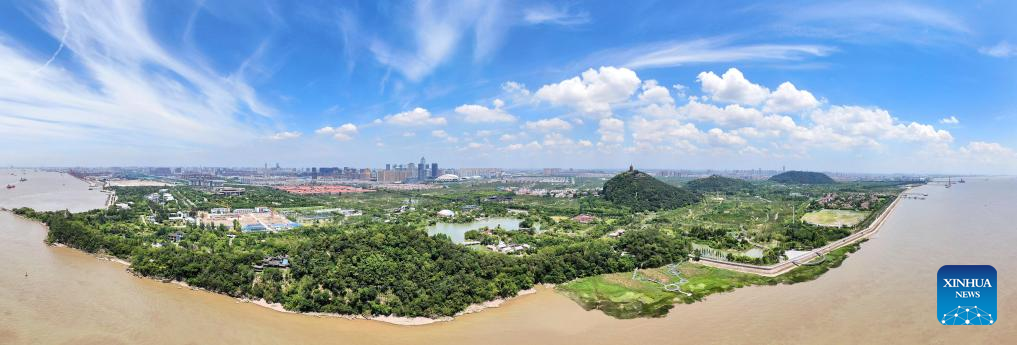 An aerial drone photo taken on Aug. 1, 2019 shows a view of a coastline of the Yangtze River in Chongshan District of Nantong, east China's Jiangsu Province. In recent years, Nantong has scaled up efforts to improve the water conservancy system, coupled with its green development endeavors in river basins and seaside areas. (Photo by Xu Congjun/Xinhua)