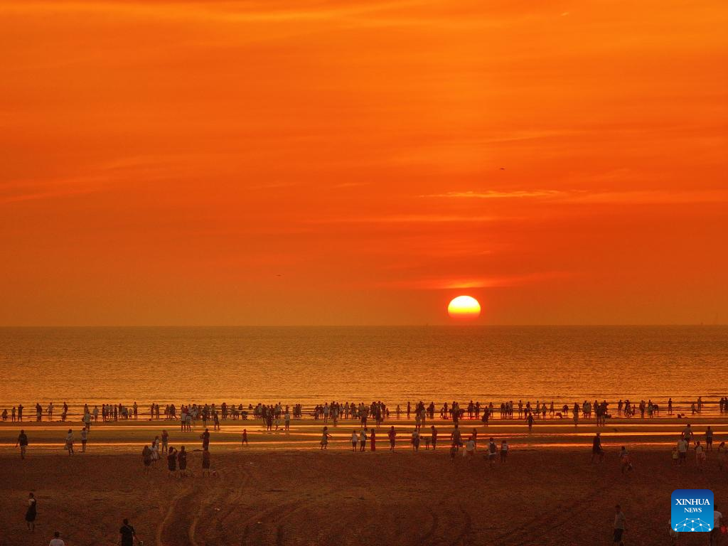 An aerial drone photo taken on Aug. 10, 2024 shows a sunrise view at a beach in Nantong, east China's Jiangsu Province. In recent years, Nantong has scaled up efforts to improve the water conservancy system, coupled with its green development endeavors in river basins and seaside areas. (Photo by Xu Congjun/Xinhua)