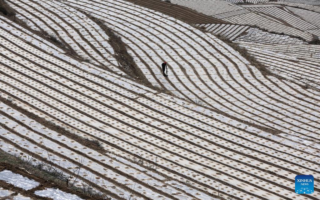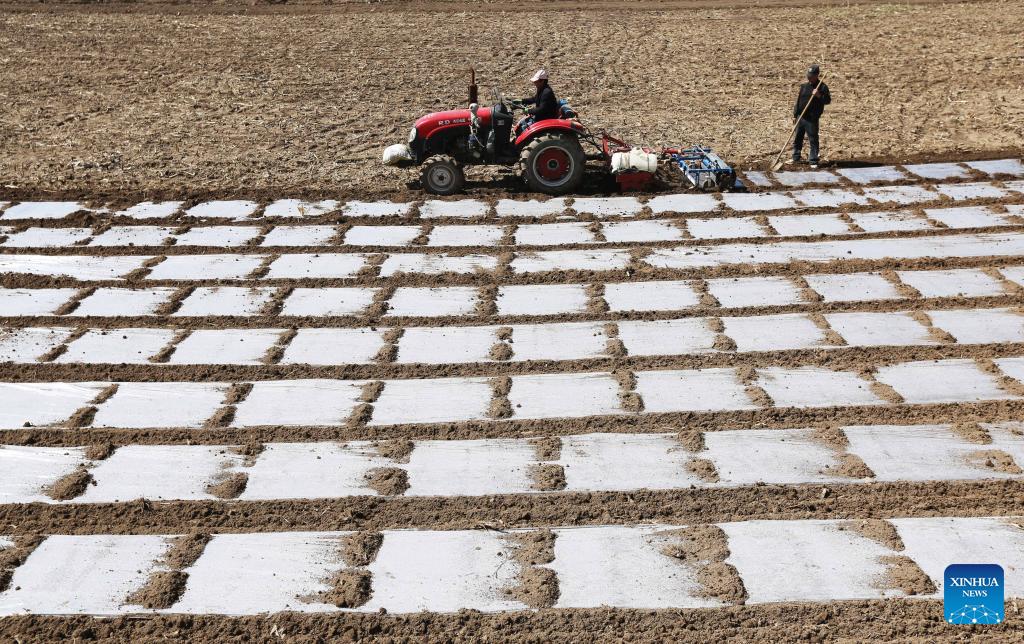 A farmer works in a field during spring plowing in a field of Mali Town, Wushan County, Tianshui City, northwest China's Gansu Province, April 1, 2026. (Photo by Wang Kexian/Xinhua)