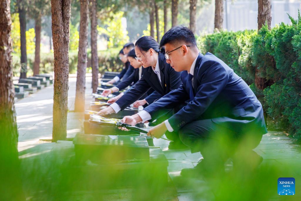 Students clean the tombstones for martyrs at a martyrs' cemetery in Shijiazhuang, north China's Hebei Province, April 2, 2026. People across the country attended various activities to pay tribute to martyrs ahead of the Qingming Festival, or Tomb-Sweeping Day, which falls on April 5 this year. (Photo by Zhang Xiaofeng/Xinhua)
