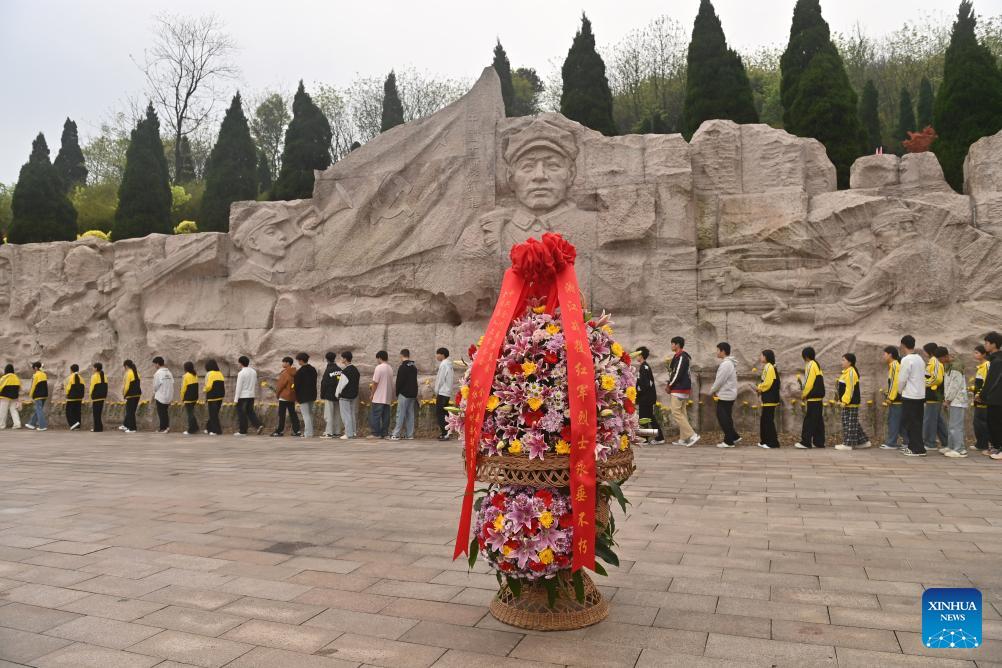 People pay tribute to martyrs at a martyrs' cemetery in Suixian County of Shangqiu City, central China's Henan Province, April 2, 2026. People across the country attended various activities to pay tribute to martyrs ahead of the Qingming Festival, or Tomb-Sweeping Day, which falls on April 5 this year. (Photo by Xu Zeyuan/Xinhua)