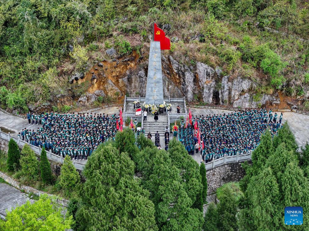 An aerial drone photo taken on April 2, 2026 shows people attending a memorial ceremony for Red Army martyrs at a memorial park in Quanzhou County, south China's Guangxi Zhuang Autonomous Region. A ceremony was held in Quanzhou on Thursday, ahead of the Qingming Festival, or Tomb-Sweeping Day, to pay tribute to the martyrs of the Red Army. (Xinhua/Lu Boan)