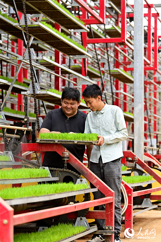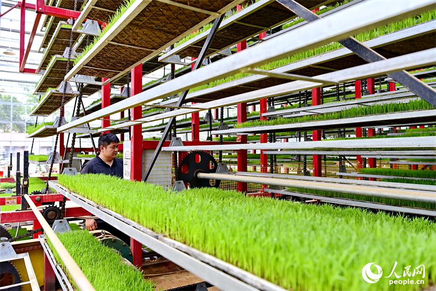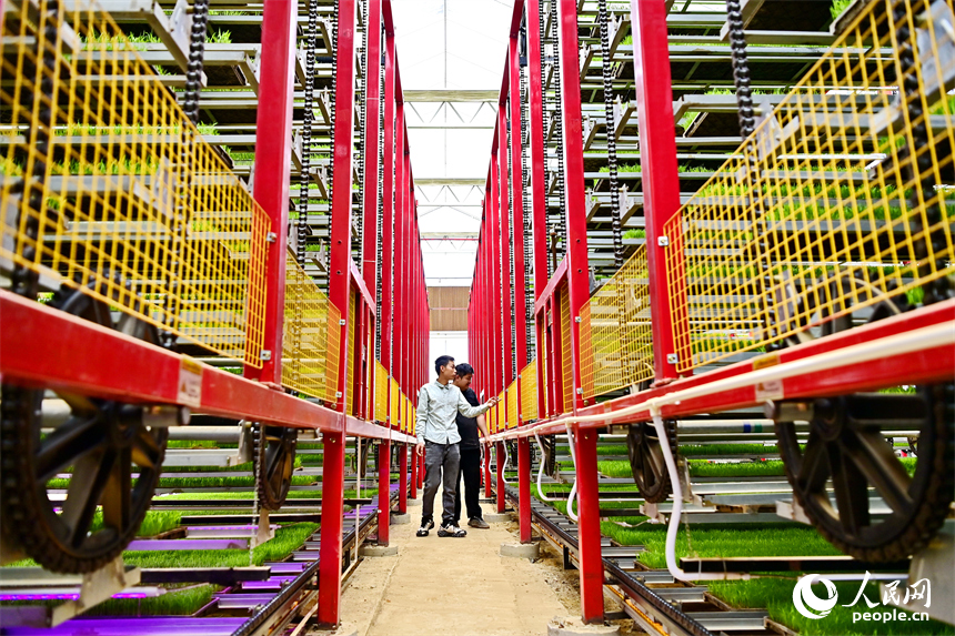 Tech-savvy farmers calibrate multi-layered vertical racks that can rotate 360 degrees at a rice seedling factory in Hengshi town, Nankang district, Ganzhou, east China's Jiangxi Province. (Photo: People's Daily Online)