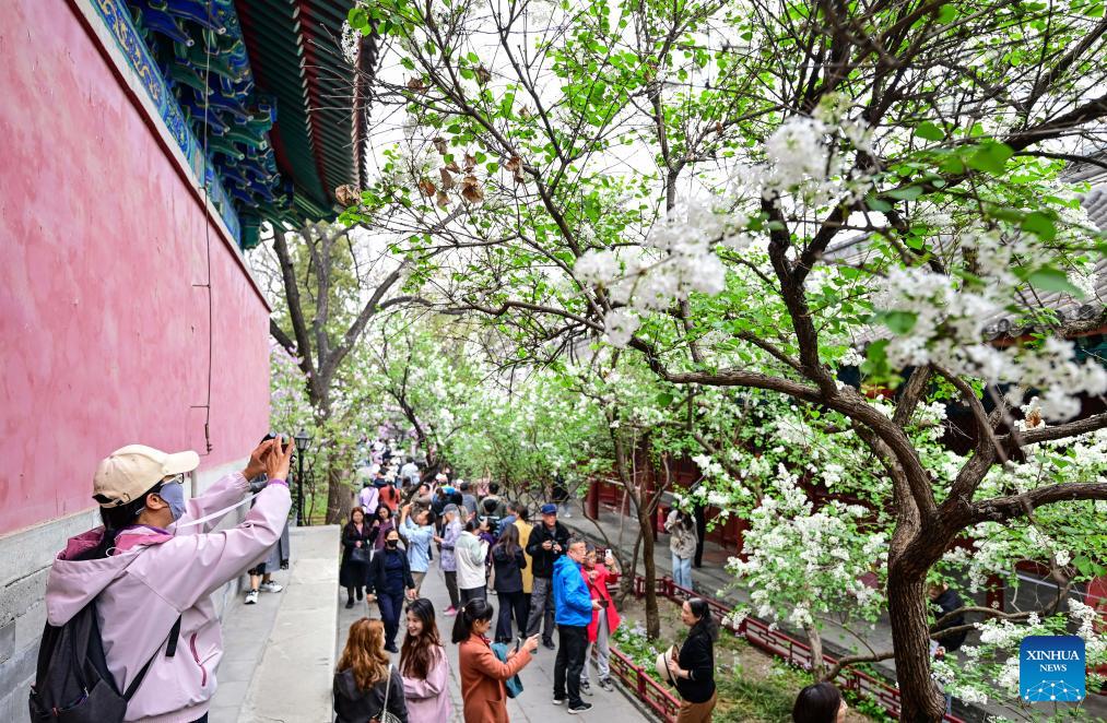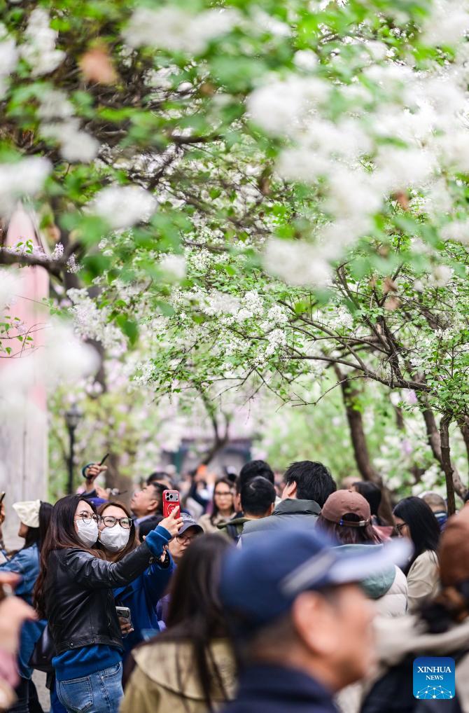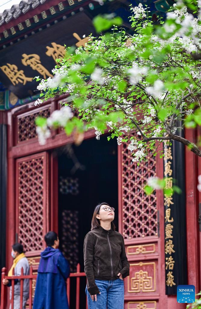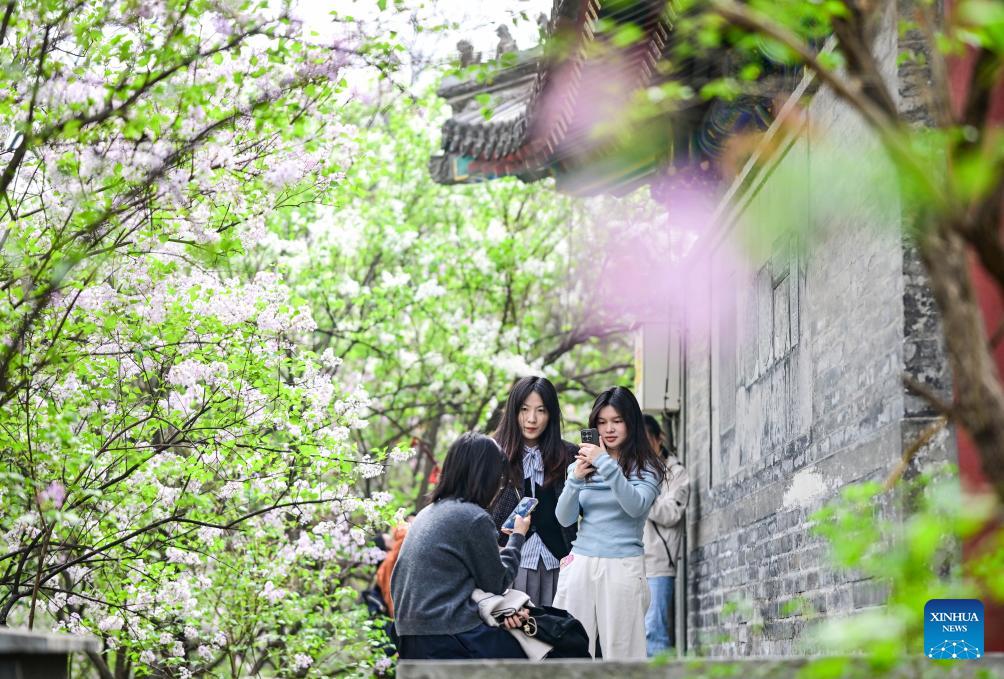 Tourists enjoy blooming lilacs at Fayuan Temple in Beijing, capital of China, April 3, 2026. (Xinhua/Chen Yehua)