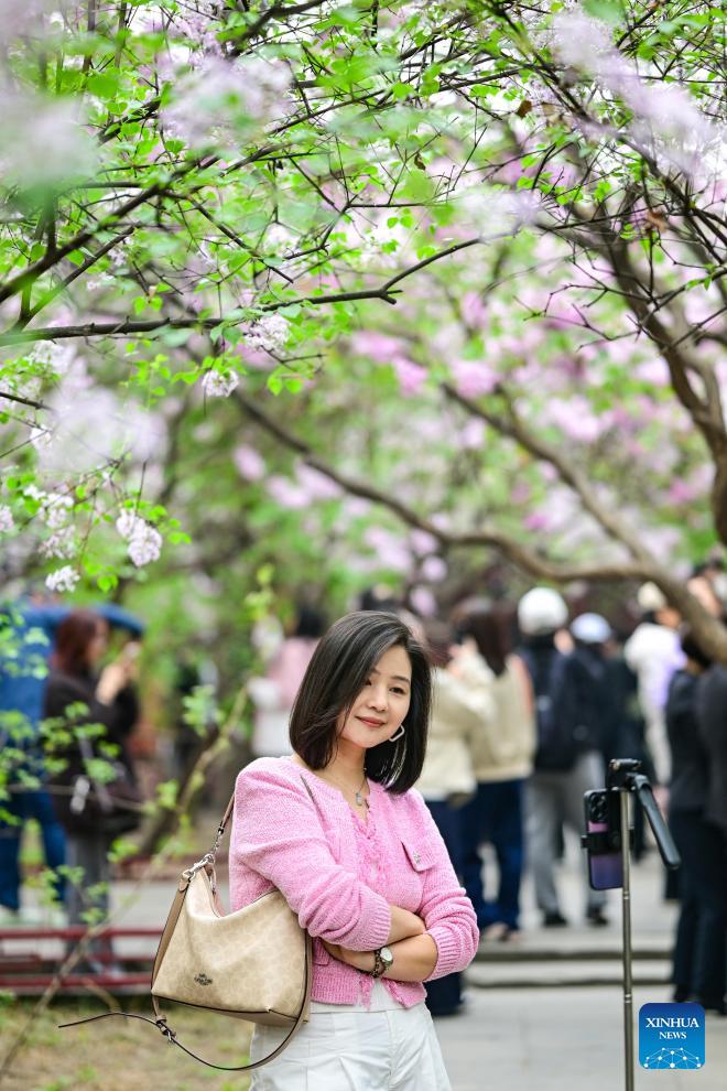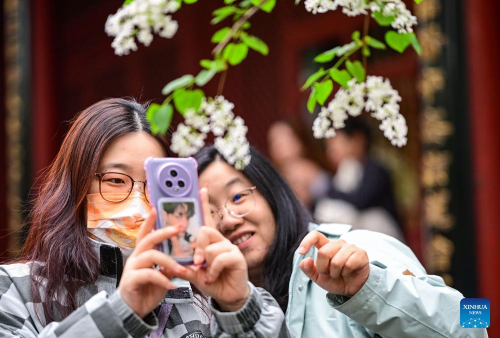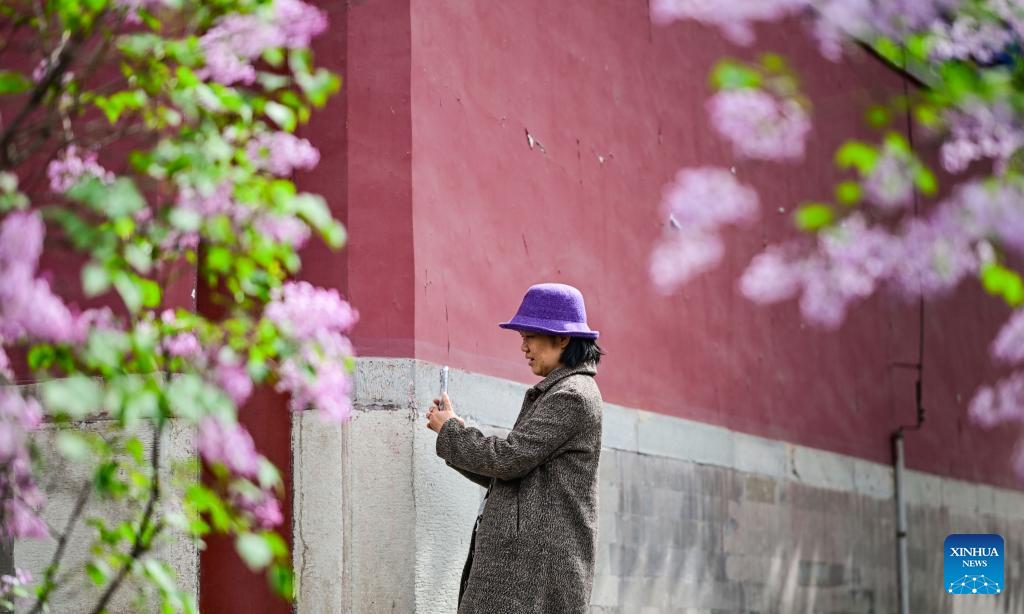 A tourist poses for selfies under blooming lilacs at Fayuan Temple in Beijing, capital of China, April 3, 2026. (Xinhua/Chen Yehua)