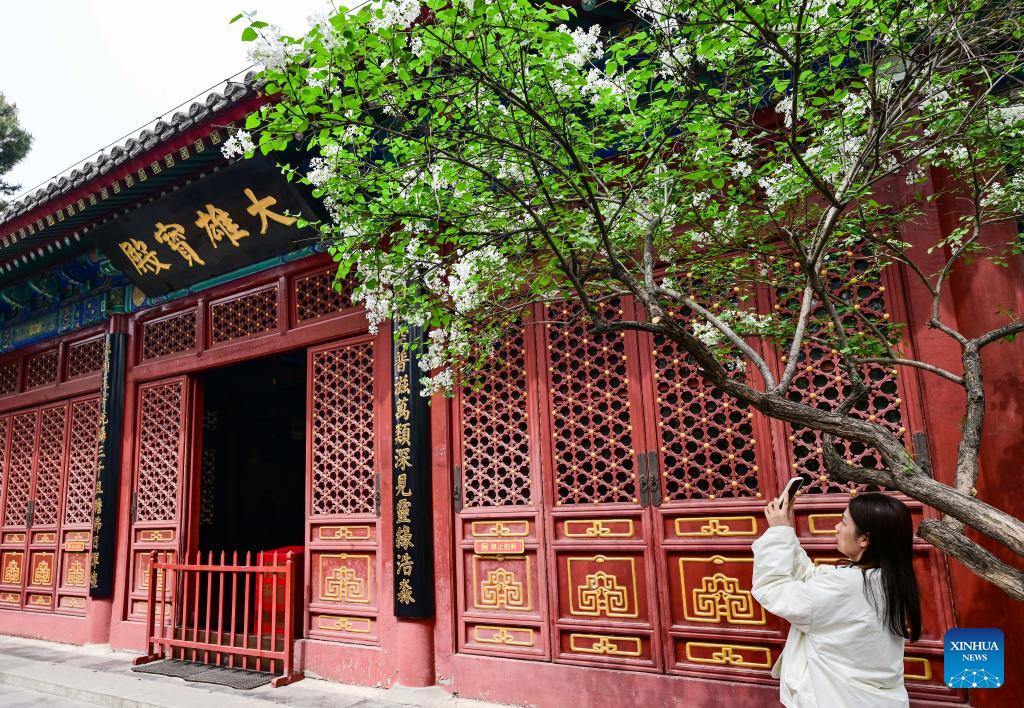 A tourist takes photos of blooming lilacs at Fayuan Temple in Beijing, capital of China, April 3, 2026. (Xinhua/Chen Yehua)