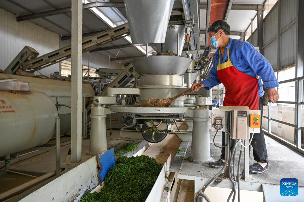 A worker processes tea leaves at a tea factory in Baofeng Town, Yongchuan District of southwest China's Chongqing Municipality, April 3, 2026. Baofeng Town in Chongqing has vigorously developed its tea industry by leveraging local advantages in recent years, establishing tea gardens that stretch across the town and into the neighboring Pilu Town in Sichuan Province. It has also promoted rural tourism to boost employment and income for villagers. The two towns have become a model for cross-provincial coordinated development. (Xinhua/Chen Cheng)
