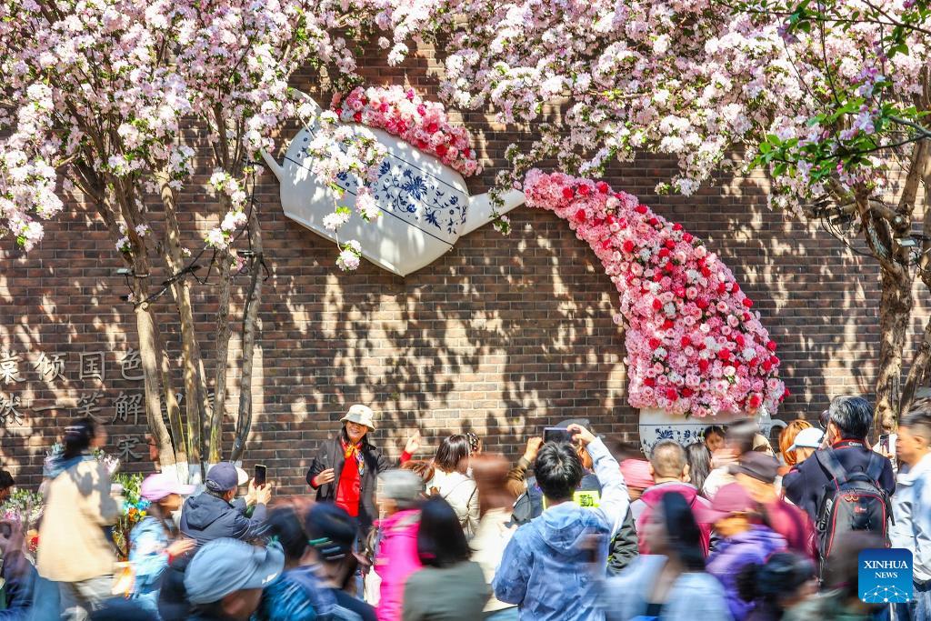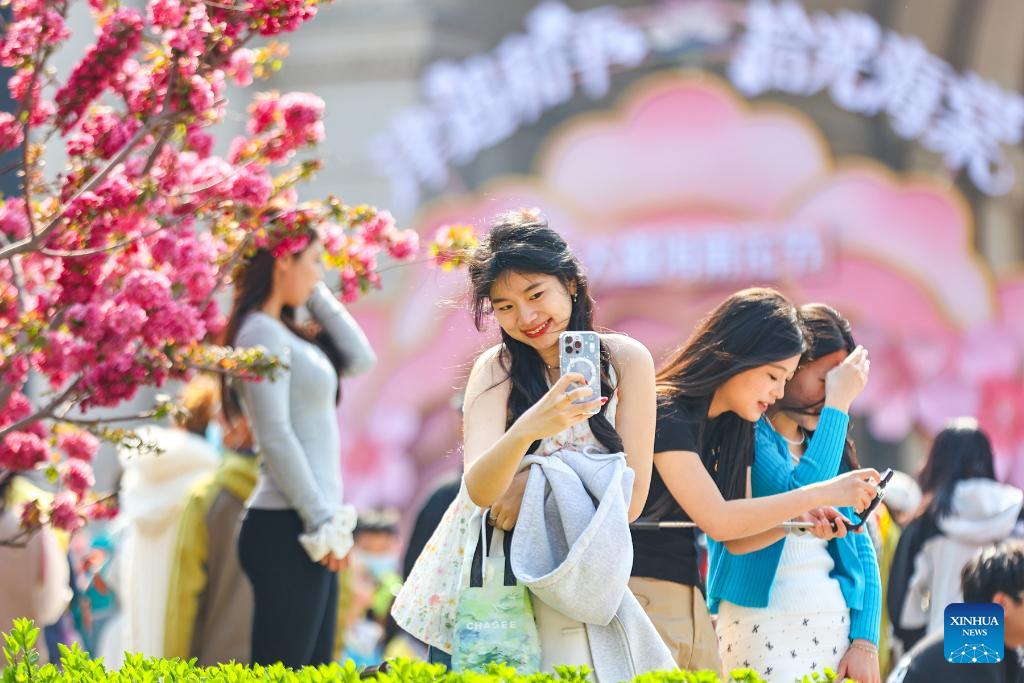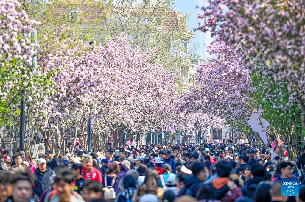 Tourists enjoy crabapple blossoms as they visit the Wudadao historical urban area in north China's Tianjin, April 4, 2026. A crabapple blossom festival is ongoing at Tianjin's Wudadao historical urban area from April 3 to 12, giving a boost to the local cultural and tourism industry. (Xinhua/Zhao Zishuo)