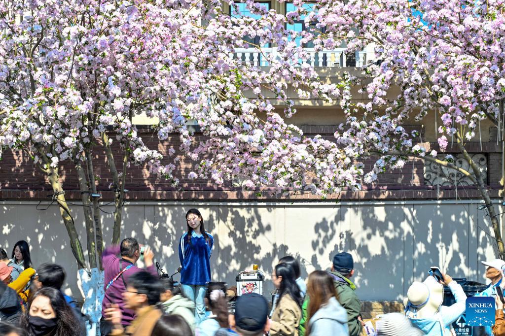Tourists enjoy crabapple blossoms as they visit the Wudadao historical urban area in north China's Tianjin, April 3, 2026. A crabapple blossom festival is ongoing at Tianjin's Wudadao historical urban area from April 3 to 12, giving a boost to the local cultural and tourism industry. (Xinhua/Zhao Zishuo)