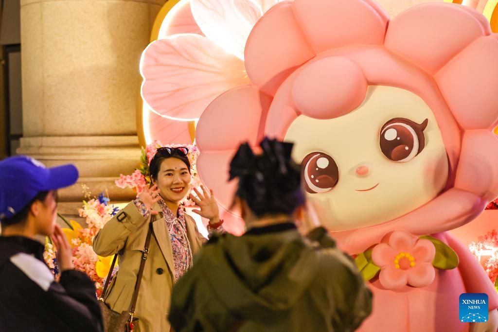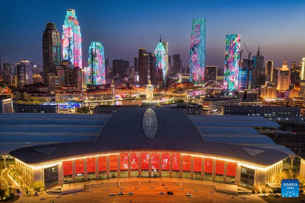A drone photo taken on April 3, 2026 from behind the Tianjin Railway Station shows a light show themed on crabapple blossoms in north China's Tianjin. A crabapple blossom festival is ongoing at Tianjin's Wudadao historical urban area from April 3 to 12, giving a boost to the local cultural and tourism industry. (Photo by Du Penghui/Xinhua)