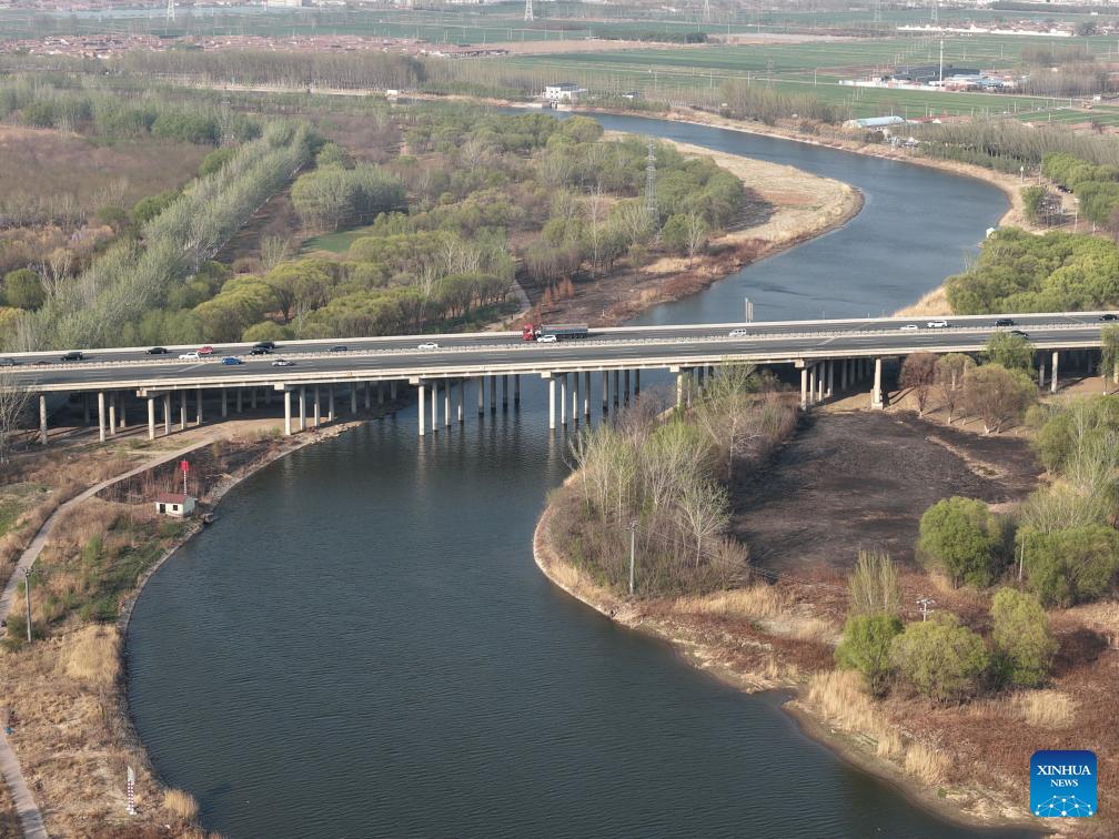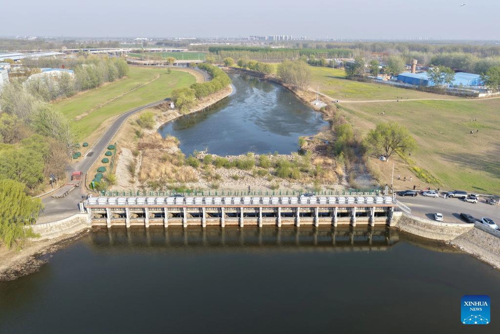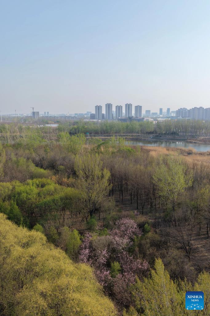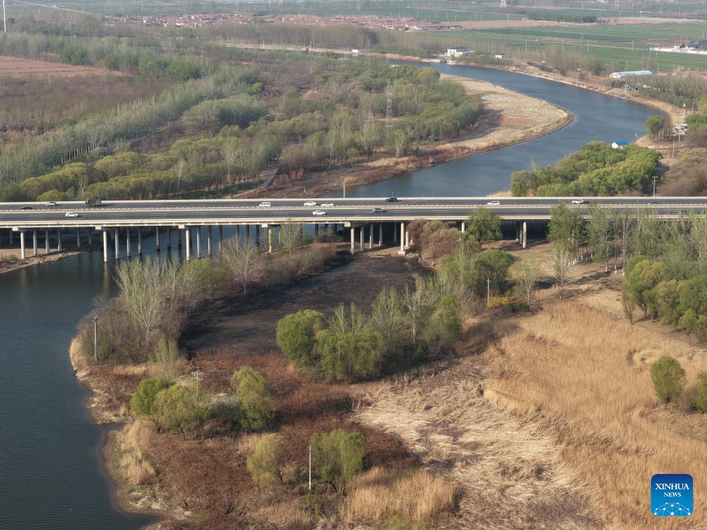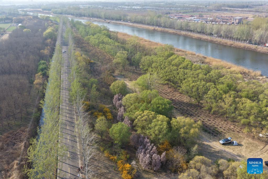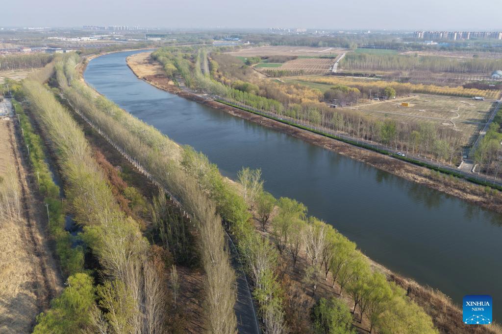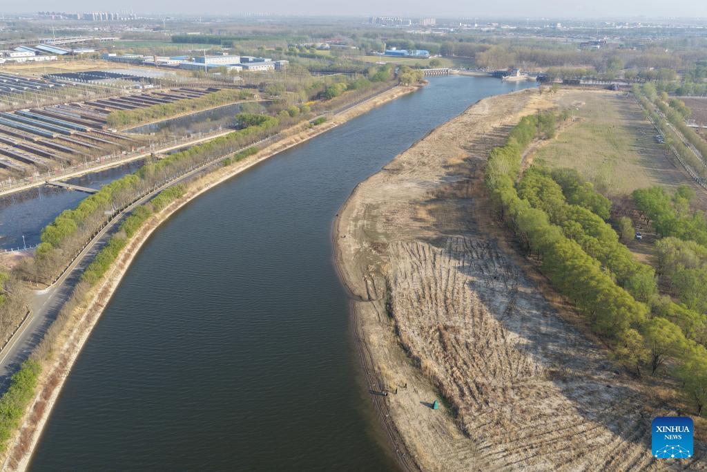 An aerial drone photo taken on April 4, 2026 shows the spring scenery in the Wuqing section of the Grand Canal in north China's Tianjin. The Grand Canal, which connects Beijing in northern China and the eastern Chinese city of Hangzhou, has a history of more than 2,500 years and is known as the world's longest artificial waterway. (Xinhua/Xing Guangli)