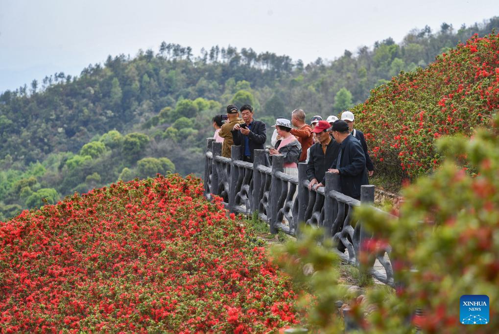 People enjoy azalea blossoms during the Qingming Festival holiday in Hengla Village of Caozhai Town in Jinhua City, east China's Zhejiang Province, April 4, 2026. (Photo by Shi Kuanbing/Xinhua)