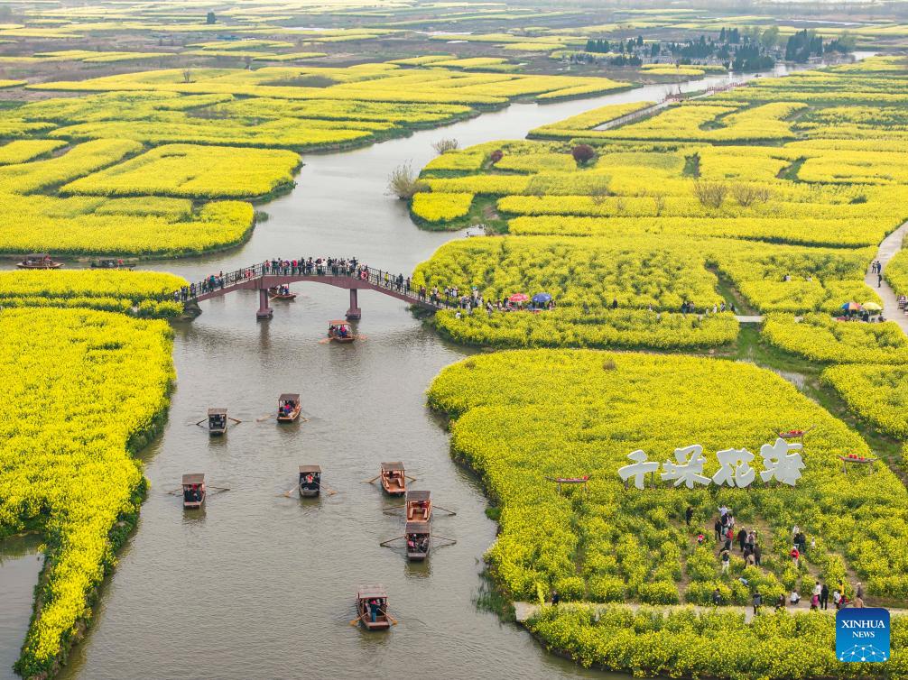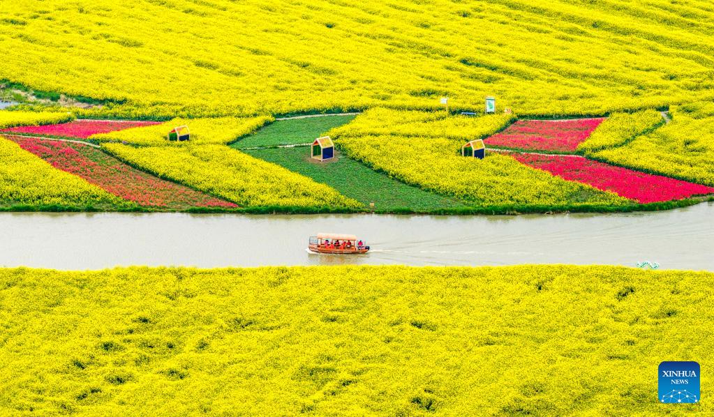 An aerial drone photo taken on April 4, 2026 shows people taking a boat for sightseeing at a flower-themed scenic area during the Qingming Festival holiday in Gaoyou City, east China's Jiangsu Province. (Photo by Zhou Shegen/Xinhua)