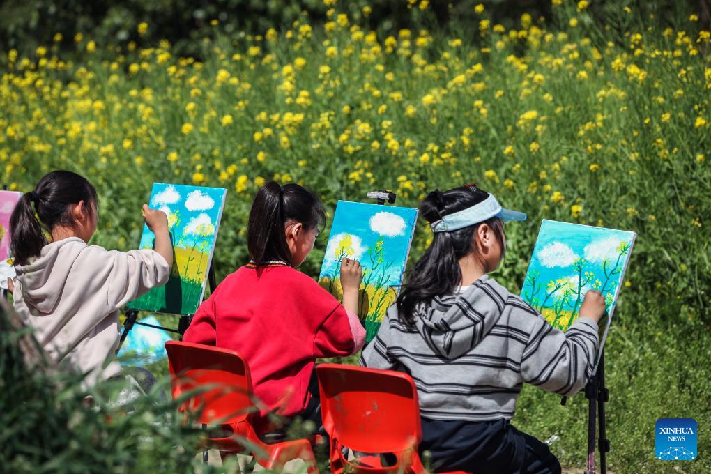 Children sketch at a park during the Qingming Festival holiday in Boai County of Jiaozuo City, central China's Henan Province, April 4, 2026. (Photo by Cheng Quan/Xinhua)