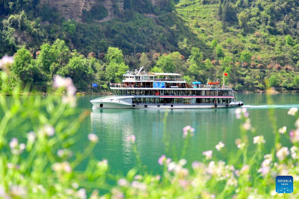 People take a boat for sightseeing in the Xiling Gorge, one of the Three Gorges on the Yangtze River, during the Qingming Festival holiday in central China's Hubei Province, April 4, 2026. (Photo by Zhang Guorong/Xinhua)