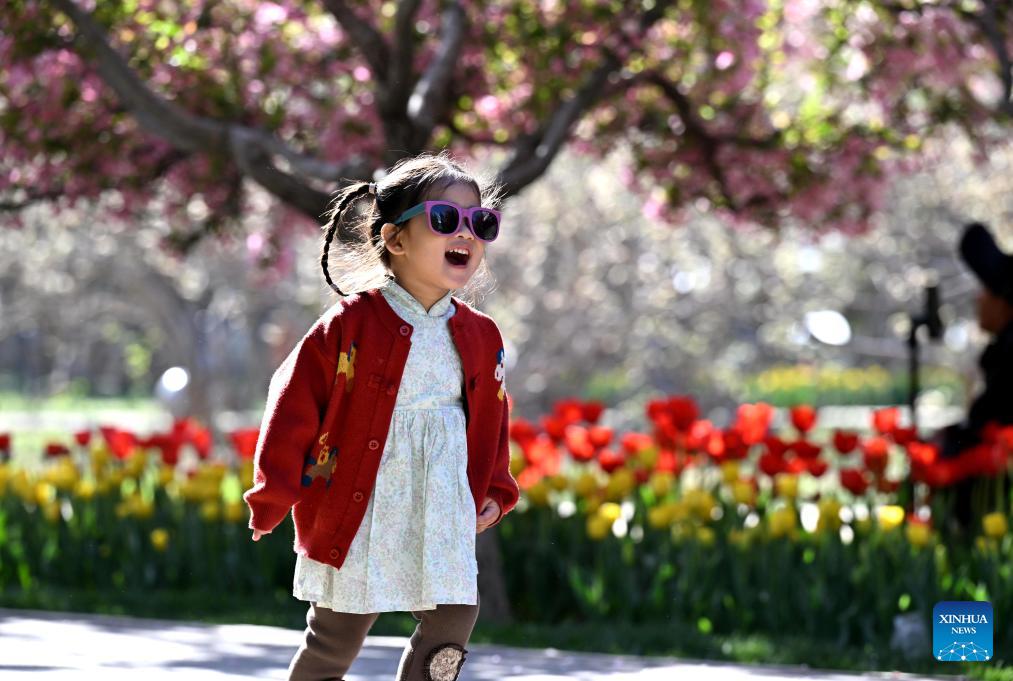 A girl visits at a botanical garden during the Qingming Festival holiday in Shijiazhuang, north China's Hebei Province, April 4, 2026. (Photo by Chen Qibao/Xinhua)