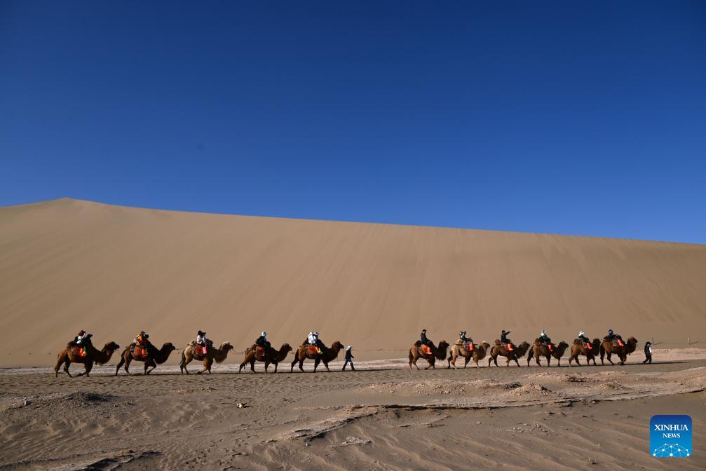 Tourists visit the Mingsha Mountain and Crescent Spring Scenic Area during the Qingming Festival holiday in Dunhuang City, northwest China's Gansu Province, April 4, 2026. (Photo by Zhang Xiaoliang/Xinhua)