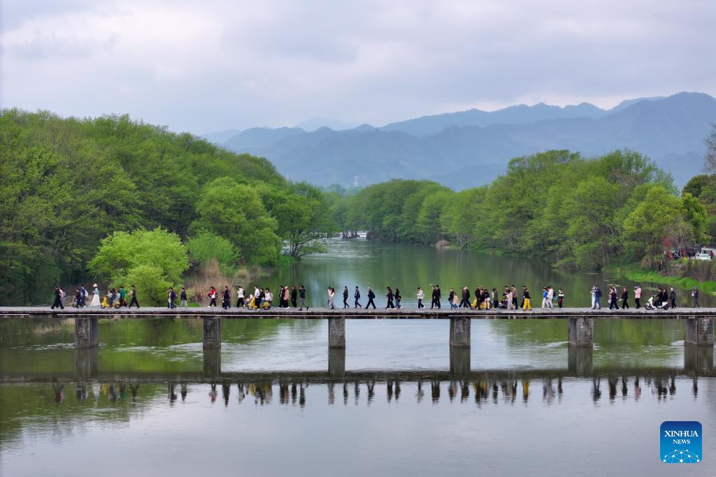 A drone photo taken on April 4, 2026 shows tourists visiting a wetland during the Qingming Festival holiday in Huangshan City, east China's Anhui Province. (Photo by Fan Chengzhu/Xinhua)