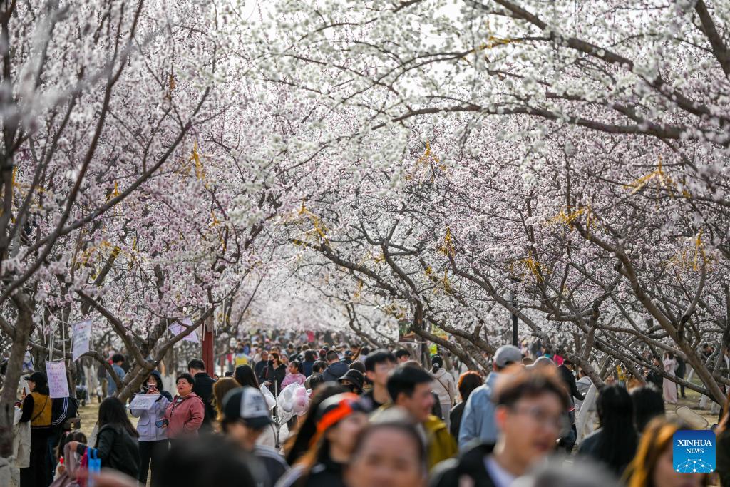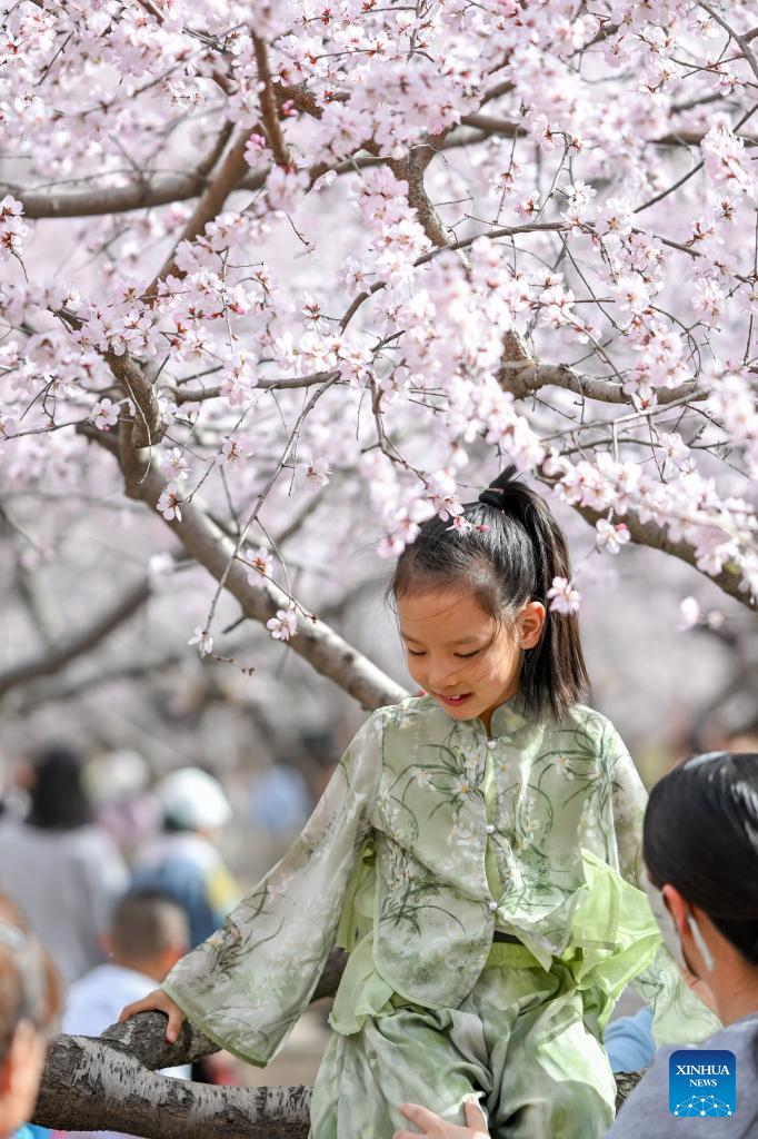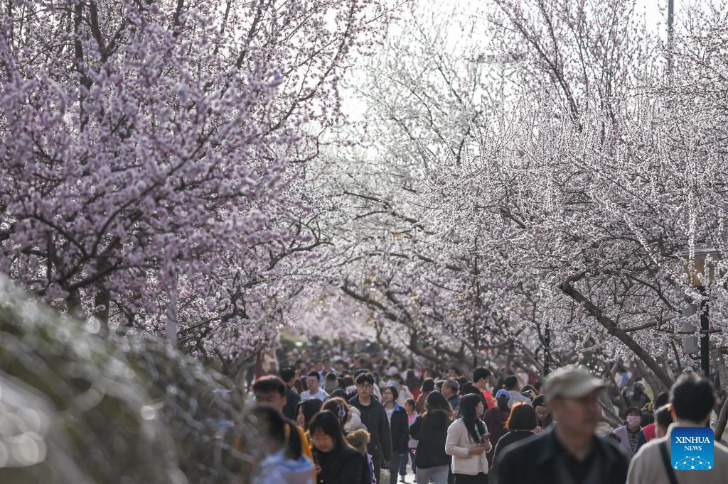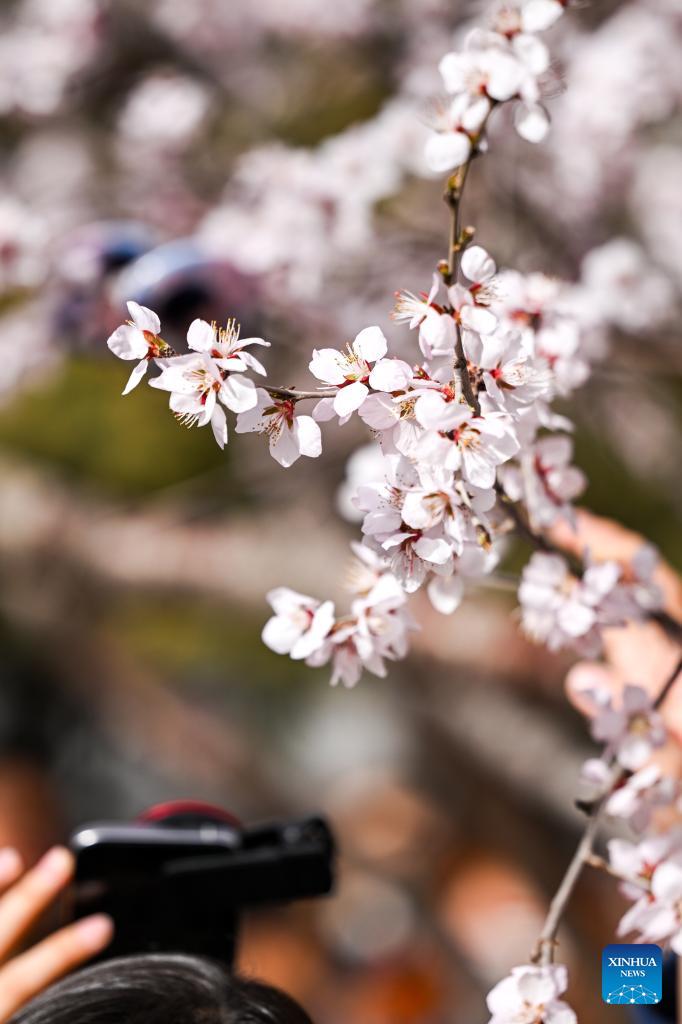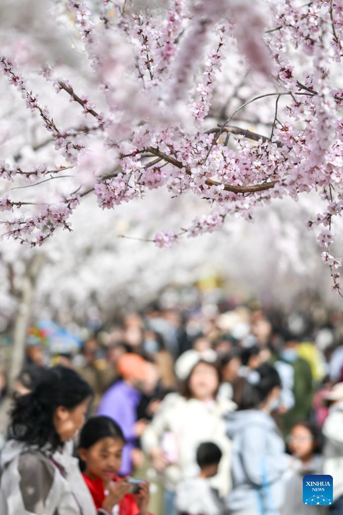 Tourists enjoy peach blossoms at park in Hohhot, N China's Inner Mongolia
