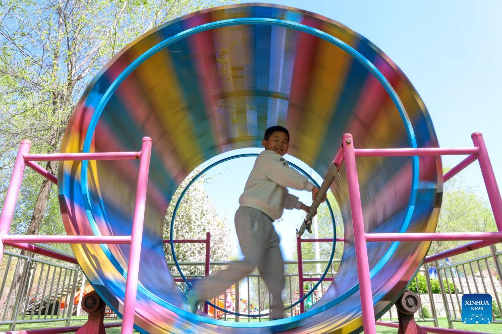 A child has fun inside an amusement facility in Liaocheng, east China's Shandong Province, April 4, 2026. Qingming Festival, or Tomb-Sweeping Day, falls on April 5 this year. It is a traditional Chinese festival for people to pay tribute to the dead and worship their ancestors. The holiday also provides a short break for Chinese citizens as they engage in outdoor activities and sightseeing. (Photo by Ma Hongkun/Xinhua)